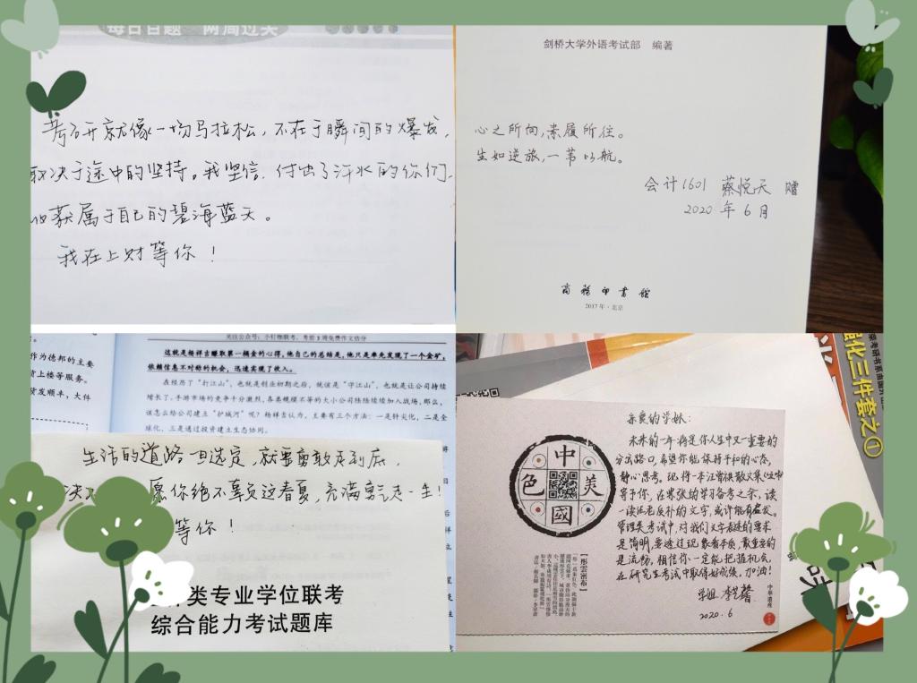 近日,会计学院大二、大三的同学们收到了一份特别的快递,原来是本届已经考研、出国成功的大四学长学姐们寄来的备考材料、书籍,书中除了满满的干货外,毕业生们还在扉页为学弟学妹们写上了寄语,“考研就像一场马拉松,不在于瞬间的爆发,而是取决于途中的坚持。”“等风来不如追风去,你的努力定不会被辜负。”