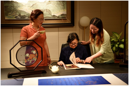 陈芙蓉老师用英文向大家介绍了南京云锦的历史与特点,并重点介绍了云锦的现代创新:如用云锦织就的书法作品。令人惊艳的是,这幅卷轴中的洒金纸效果都是用云锦技术织就而成,充分展示了中国云锦技术的复杂与精妙。