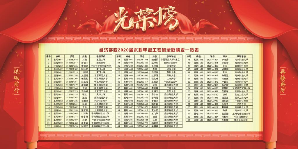 近日,经济学院2020届毕业生在全国硕士研究生考试中捷报频传,考研成绩喜人,再创历史新高。全院考研正式录取64人, 其中33名学生被双一流高校录取,其中,经统1603班考取18人,考研升学率高达36%。
