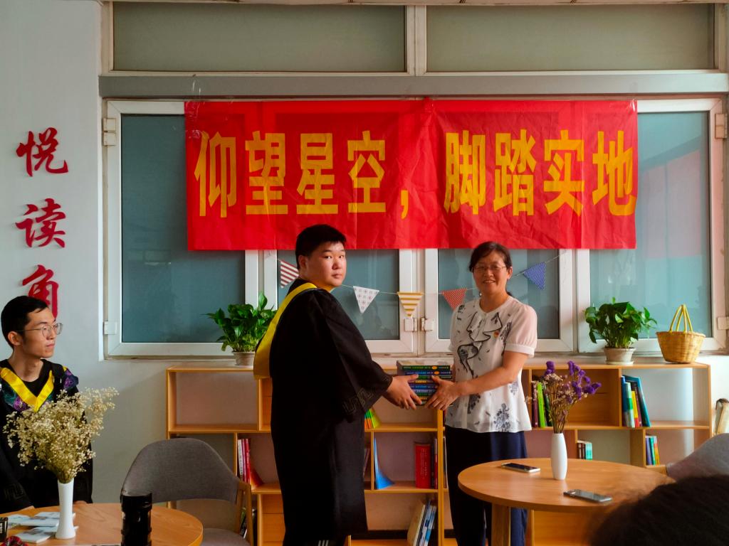 张楠作为毕业生代表与周亚芳书记作悦读角交接。