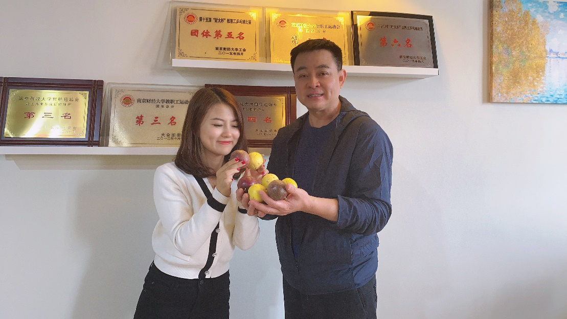 2013年进入南京财经大学英语系学习的石贤,来自贵州从江山区,在校期间,品学兼优、坚强独立的她看到家乡侗族文化的式微,创建了“古梦清泉侗族文化传承志愿团”,连续数年举办少年侗歌班。毕业后,她创办了卧松云文化发展有限公司,组织当地绣娘开展手工制作,挽救侗族手工艺。她一直热心于公益事业,积极配合当地政府助力脱贫攻坚,认购了一批贫困户种植的百香果,在金秋十月为老师们寄来了一箱百香果,以感念老师们的培养。