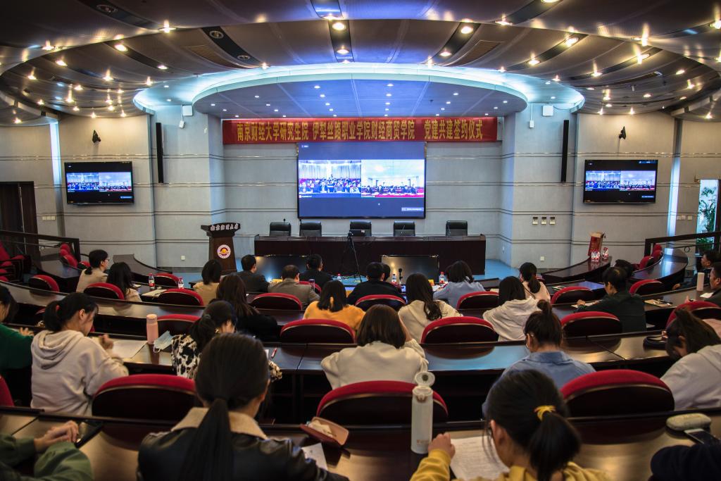 11月13日下午,我校研究生院与伊犁丝路职业学院财经商贸学院(原伊犁财贸学校)在仙林校区行政楼二楼报告厅和伊犁丝路职业学院四楼会议室通过腾讯会议开展党建共建活动。江苏省对口支援新疆前方指挥部干部人才组组长、伊犁州党委组织部副部长马培伟,我校党委常委、副校长李群,党委常委、组织部部长赵国栋,伊犁丝路职业学院党委书记赵泰峰,党委副书记、院长储开峰,党委委员王军强出席会议,我校研究生院党支部全体成员及伊犁丝路职业学院财经商贸学院全体党员参加会议。会议由党委研究生工作部副部长、研究生院副院长、研究生院党支部副书记华凌志主持。