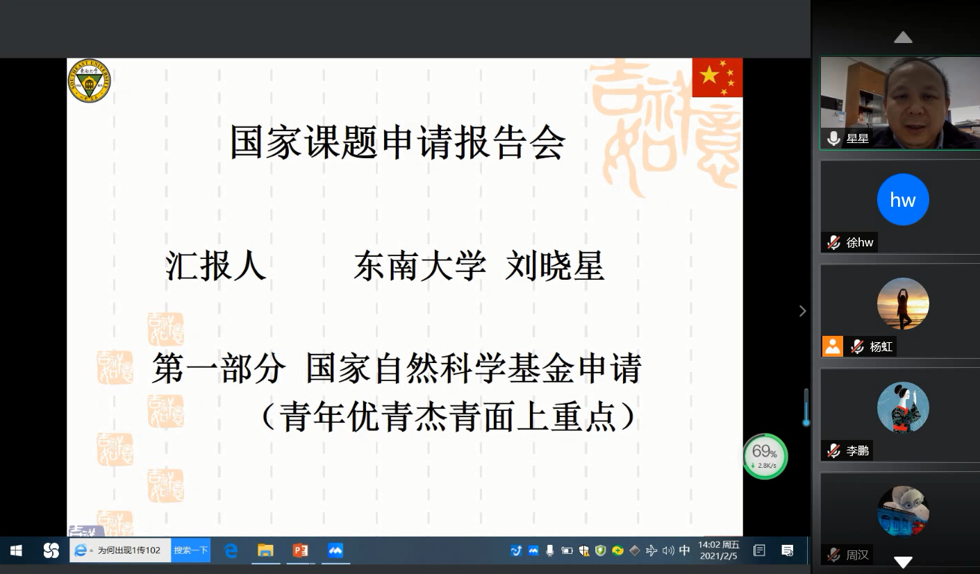 2月4日-6日,应金融学院邀请,东南大学教授刘晓星、中山大学教授李仲飞、南京航空航天大学教授王群伟、南京理工大学教授王玉东、我校国际经贸学院教授余泳泽通过线上(腾讯会议)进行了国家课题申报指导。刘晓星教授与王群伟教授分别作了题为“国家课题申报体会”和“申请书的内在逻辑和外在形式”的讲座。金融学院预申报国家课题的教师参加了指导会。会议由学院副院长郭文旌主持。