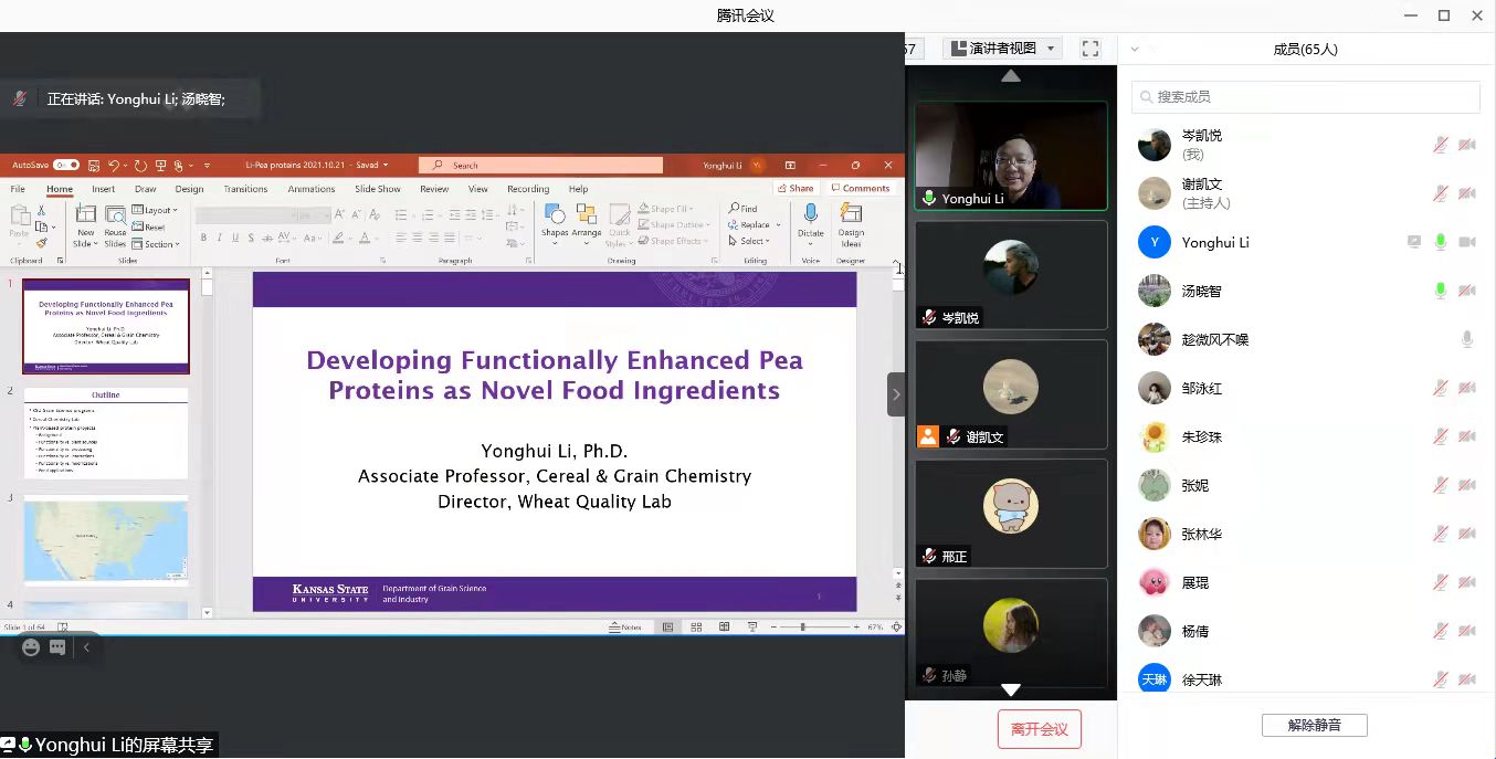 10月22日上午,应食品科学与工程学院邀请,美国堪萨斯州立大学李永辉教授作了题为“Developing functionally enhanced pea proteins as novel food ingredients”的线上学术报告。食品科学与工程学院部分师生代表参加报告会。报告会由食品科学与工程学院副院长汤晓智教授主持。