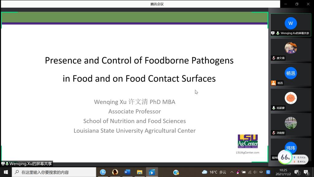11月2日上午,应食品科学与工程学院邀请,美国路易斯安那州立大学副教授许文清作了题为“Presence and Control of Foodborne Pathogens in Food and on Food Contact Surfaces”的线上学术报告。食品科学与工程学院部分师生聆听报告。报告会由食品科学与工程学院教授陆颖健主持。