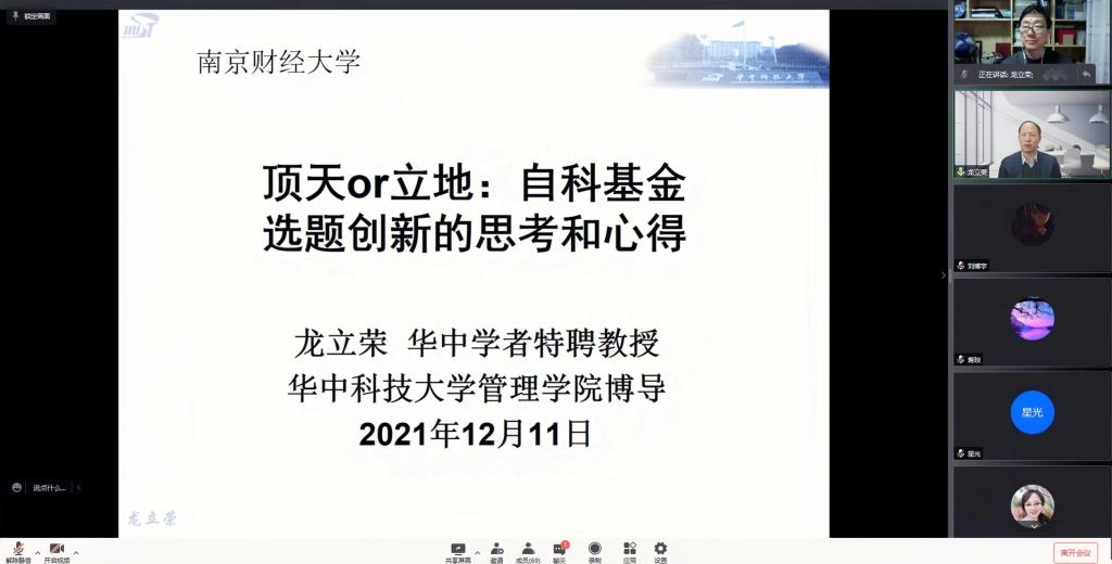 12月11日晚,应工商管理学院邀请,华中科技大学管理学院副院长、博士生导师、华中学者特聘教授龙立荣,通过腾讯会议作了题为“自科基金选题申报和评审的思考与心得”的报告。工商管理学院副院长蒋琰和张文勤以及部分教师聆听了报告。报告由学院院长万绪才主持。