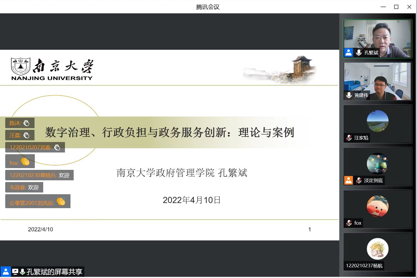 4月10日下午,应公共管理学院邀请,全国公共管理专业硕士学位教育指导委员会委员、南京大学政府管理学院院长孔繁斌教授在线作了题为“数字治理、行政负担与政务服务创新:理论与案例”的讲座。公共管理学院部分MPA师生、学术型研究生和高年级本科生100余人聆听了讲座。讲座由我校政府管理研究中心主任、MPA教育中心主任黄建伟教授主持。