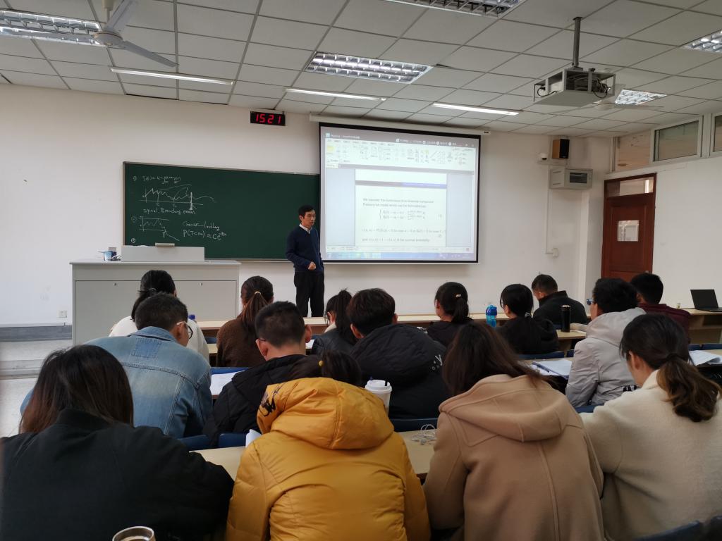 李应求教授介绍了随机环境中的G-W过程、双性分支过程的条件平均生长率等问题,给出了该过程条件平均生长率的上下界,最后讨论了交配单位归一化数量与每一代雌性或雄性数量的等价性定理。郭军义教授从最简单的问题入手,介绍了随机过程在金融保险中的应用,以及风险理论,应用概率和金融保险中的随机优化等问题。讲座中,两位教授深入浅出地剖析有关问题,并启发在座师生一起思考。