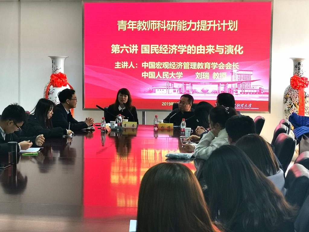 讲座围绕“国民经济学的由来与演化”展开,从国民经济学定义、国民经济学起源、中国特色的国民经济学科建设发展过程等方面详实分析了不同时代背景下国民经济学的演变过程,用学科演变过程折射中国特色社会主义经济学科体系建设的变动逻辑和历史轨迹,为在场青年教师和学生带来一场国民经济学学术盛宴。讲座结束后,在座青年教师与刘瑞教授进行了深入的学术交流,现场反响热烈。