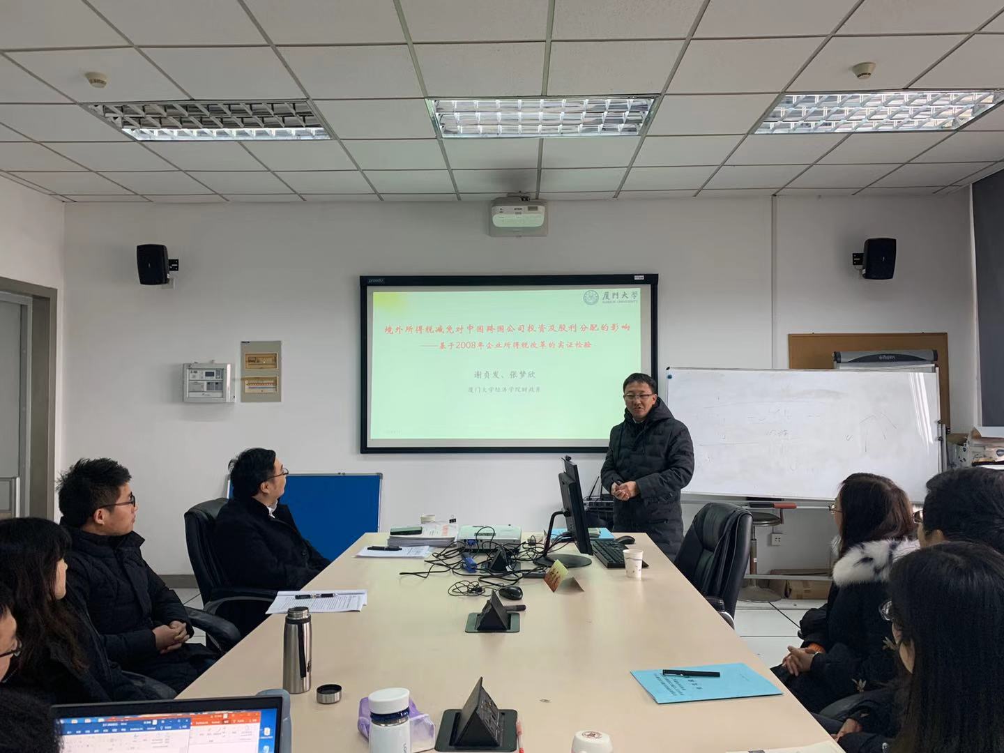 1月15日下午,应财政与税务学院、公共财政研究中心邀请,国家社科基金重大项目首席专家、福建省百千万人才工程省级人选、中国财政学会理事、博士生导师、厦门大学经济学院教授谢贞发在仙林校区德经楼427室作了题为“境外所得税减免对中国跨国公司投资及股利分配的影响”的学术讲座。讲座由财政与税务学院院长、公共财政研究中心主任朱军主持,财政与税务学院部分教师和研究生参加了讲座。