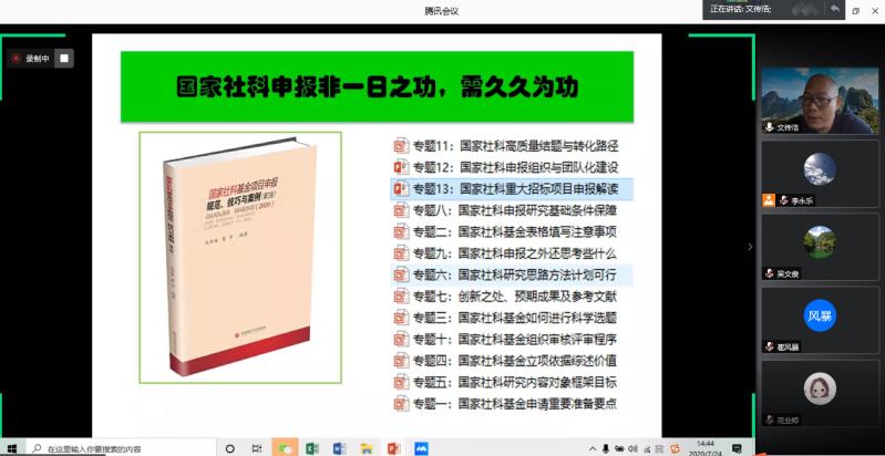 7月24日下午,应公共管理学院邀请,云南大学经济学院博士生导师、教授文传浩在线(腾讯会议)作了题为“国家社科基金如何进行科学选题”的学术讲座。我校部分青年教师参加讲座。讲座由公共管理学院院长黄斌主持。