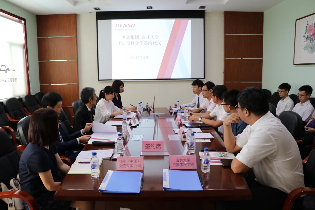 加藤本部长简述了电装集团的发展历程和核心理念,对吉速车队和电装集团在造物精神方面的统一性表示高度肯定,表达了对学院教育成果的赞扬,希望车队到日本参加FSJ比赛。车队队长王新宇简述了车队的成果和发展现状并对电装集团的支持表达了诚挚的感谢。随后,yd2333云顶电子游戏党委书记李善兴和电装(中国)投资有限公司本部长加藤明弥共同签署了车队资助协议。双方将从交流科技创新,提升人才培养质量方面开展合作。电装公司将为吉林大学吉速车队提供24万元人民币的资金支持以及相关技术、设备支撑,在零部件采购加工等方面为车队提供便利条件,致力于帮助吉速车队在中国大学生方程式大赛上取得更加优异的成绩。