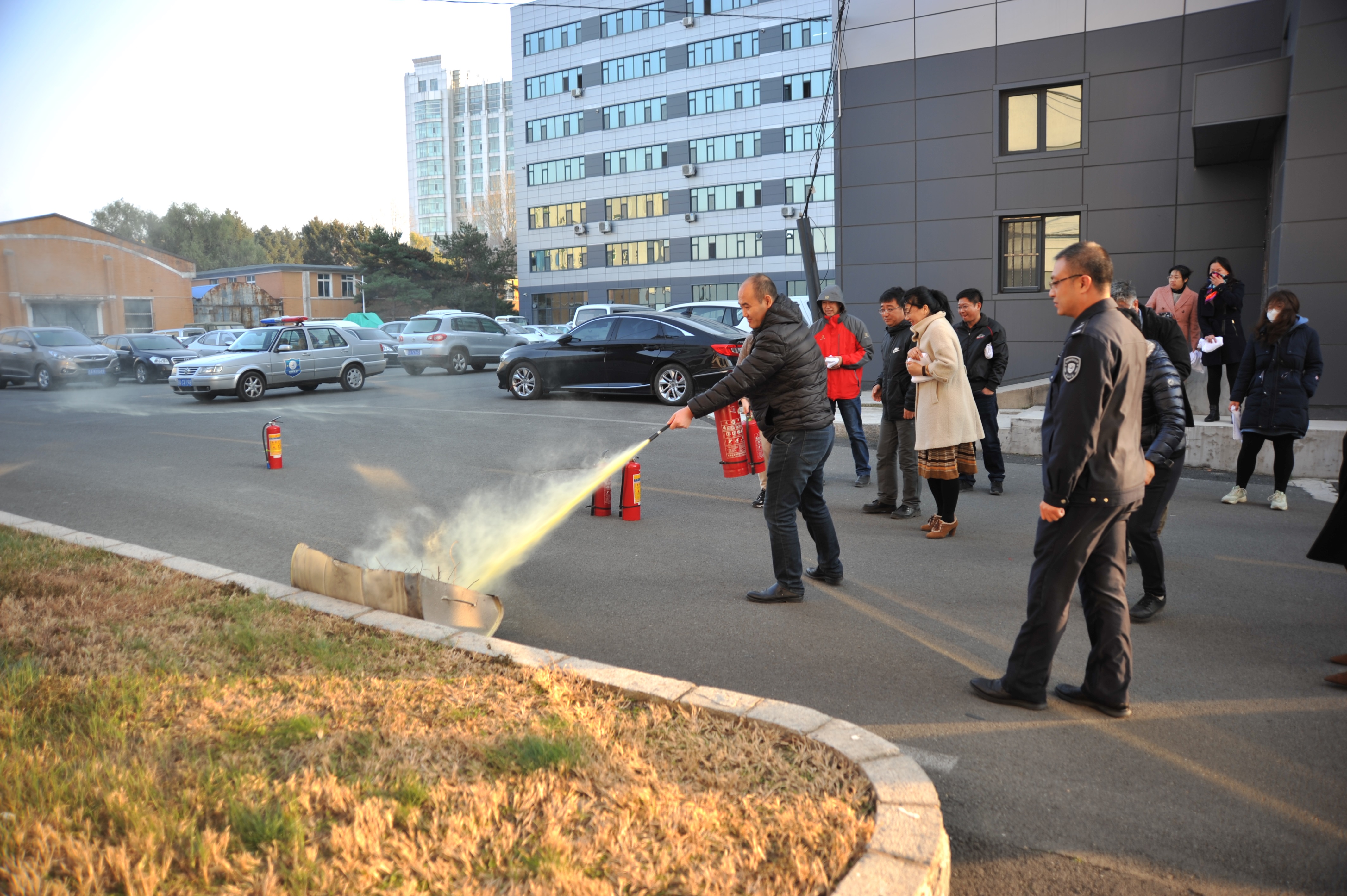 首先,由东区保卫办防火科科长韩旭结合消防法、消防工作管理办法以及具体案例,为师生讲解了消防安全知识与火灾逃生常识。随后,全体参会师生在俊民楼进行防火疏散演练。参演师生反应迅速,有序疏散,几分钟后,楼内的师生全部安全疏散到室外。在俊民楼南侧,防火科老师为师生讲解并演示了灭火器的使用方法,部分师生现场进行了灭火演练。