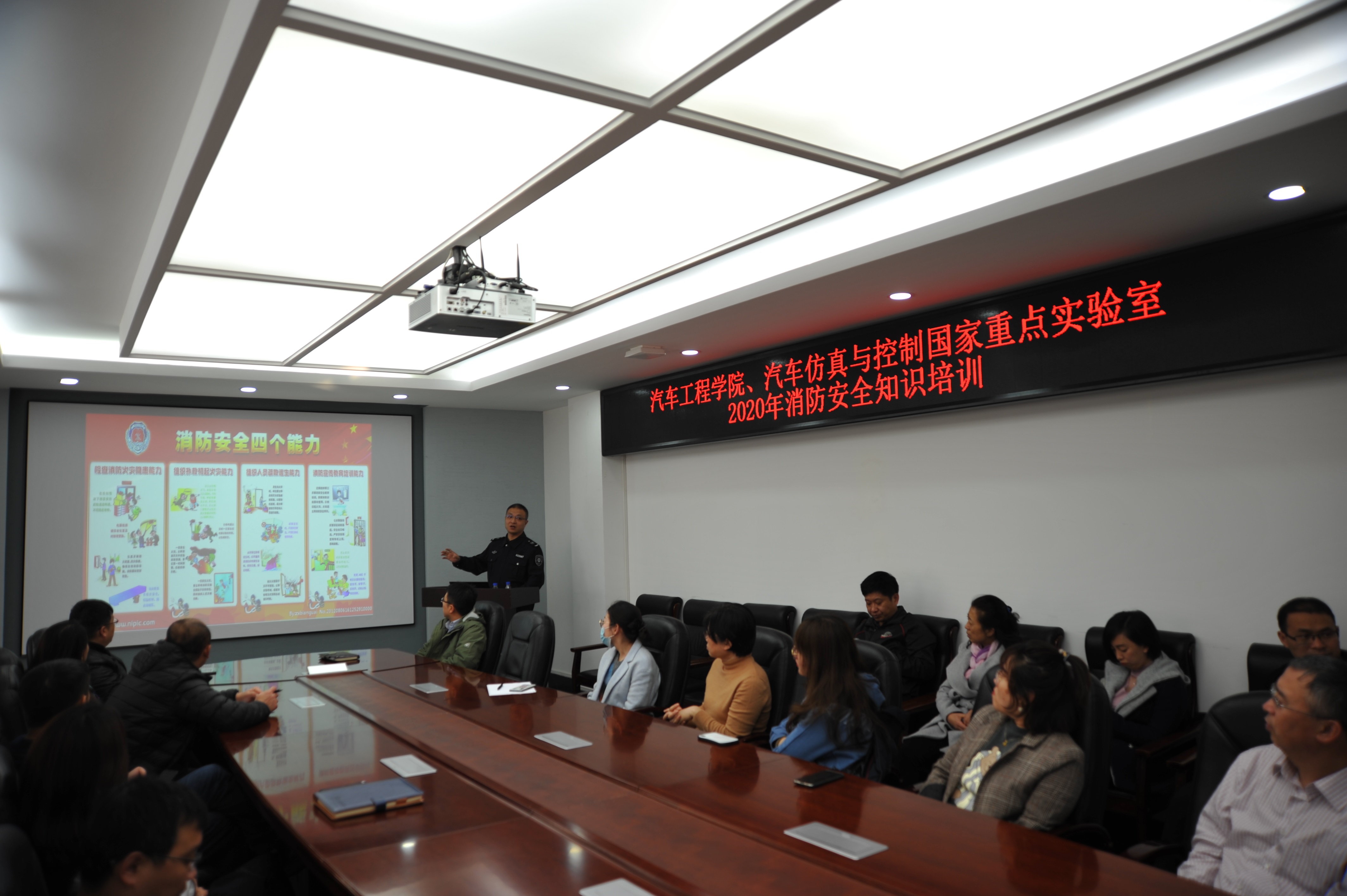 11月5日下午,yd2333云顶电子游戏、汽车仿真与控制国家重点实验室联合东区保卫办举行了“2020年消防安全知识培训与防火疏散演练”活动。学院行政副院长林海兰、重点实验室副主任杨得军以及师生代表参加了此次活动。本次活动分为安全知识讲座、防火疏散演练和消防器材使用三个环节。