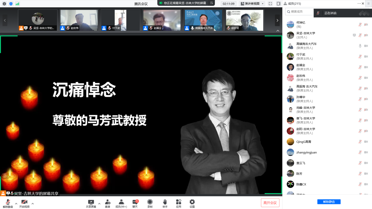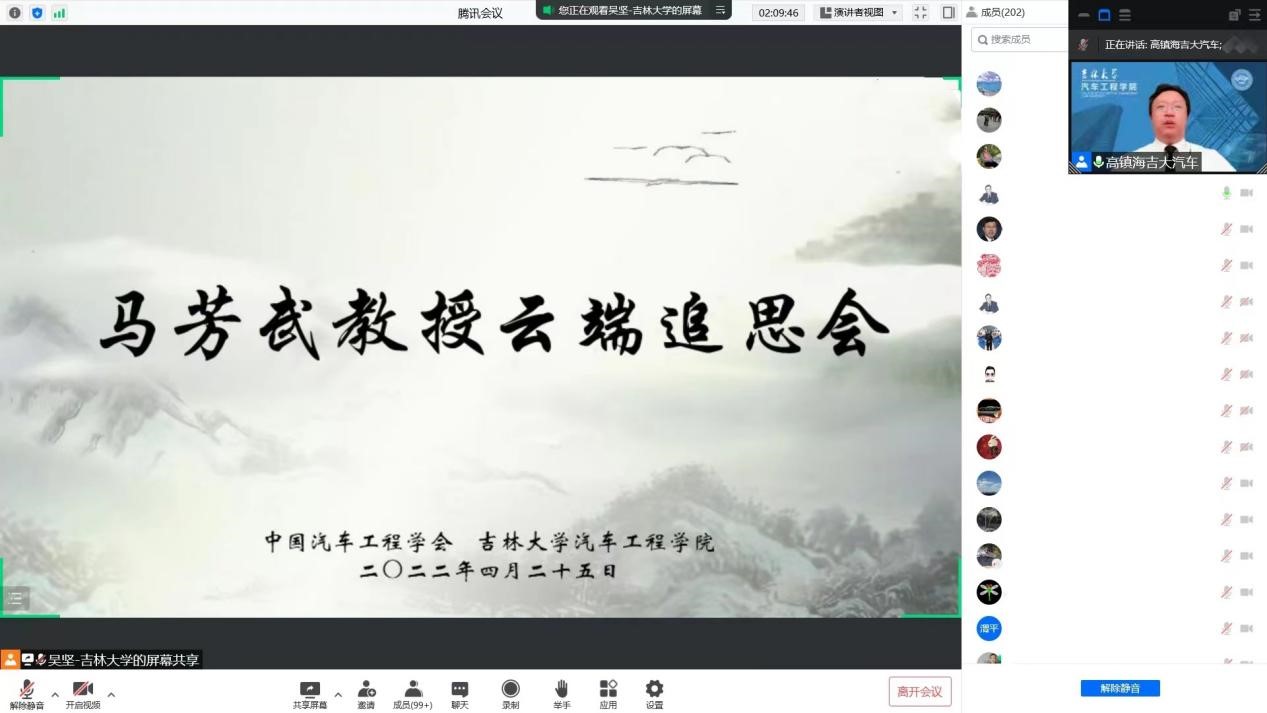 2022年4月21日,FISITA技术领导力会士、SAE International会士、中国汽车工程学会会士、《Automotive Innovation》执行主编、吉林大学工程学院马芳武教授因病在长春逝世。为在疫情期间做好马芳武教授的悼念活动,4月25日,中国汽车工程学会、yd2333云顶电子游戏在腾讯会议平台联合举办云端追思会。来自吉林大学、汽车行业学会、企事业单位、海内外校友代表,以及马芳武教授的亲朋、同事、同学、学生等近四百人共同缅怀追思。会议由yd2333云顶电子游戏院长、汽车仿真与控制国家重点实验室主任高振海主持。