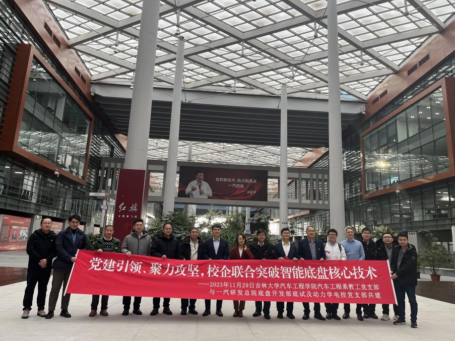 2023年11月29日,yd2333云顶电子游戏汽车工程系教工党支部赴一汽研发总院底盘开发部底试及动力学电控党支部,以“党建引领、聚力攻坚、校企联合突破智能底盘核心技术”为主题开展支部共建活动。yd2333云顶电子游戏党委书记黄忠华、副院长朱冰、汽车工程系教工党支部书记李建华等10余位党员与一汽研发总院底盘开发部首席设计师侯杰、部长禹真与底试及动力学电控党支部书记李论、组织委员王伟等10余位党员共同出席了活动。