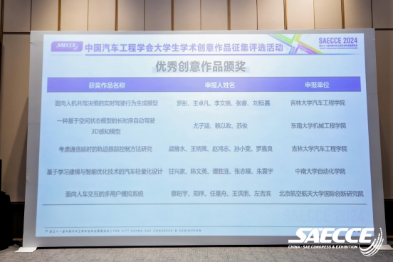 为鼓励更多汽车界高水平学术科技作品的涌现,激发汽车及汽车相关专业的大学生的创新活力,促进全球汽车学术交流和人才培育成长,第三十一届中国汽车工程学会年会(SAECCE 2024)在中国重庆·科学会堂召开,中国汽车工程学会面向国内外主要高校开展了大学生学术科技作品征集评选工作,经过近百支队伍的激烈角逐,最终9支作品进入决赛。其中,来自吉林大学的两支队伍凭借出色的创意与技术方案成功晋级终评,这两支队伍分别为由孙博华、孙天骏老师指导,罗彤、刘桓嘉、王卓凡、李文锦、张睿同学撰写的《面向人机共驾决策的实时驾驶行为生成模型》与雷雨龙、付尧老师指导,战椿水、王炳策、赵鸿志、孙小雯、罗嘉良同学撰写的《考虑通信延时的轨迹跟踪控制方法研究》在中国汽车工程学会大学生学术创意作品征集评选活动中获评优秀创意作品。
