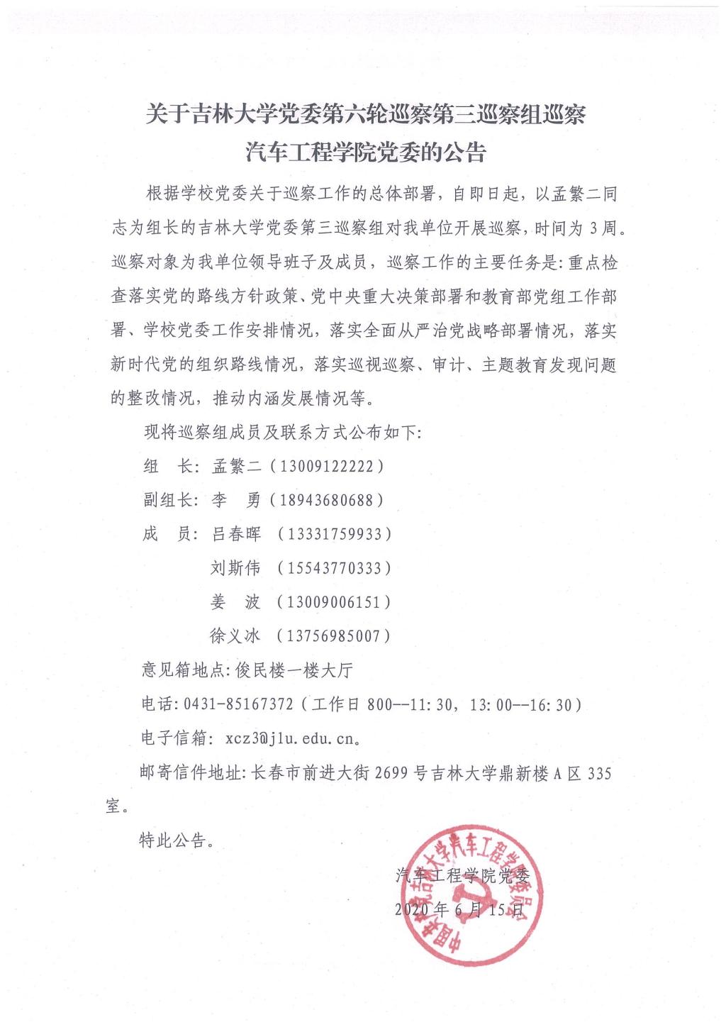关于吉林大学党委第六轮巡察第三巡察组巡察yd2333云顶电子游戏党委的公告