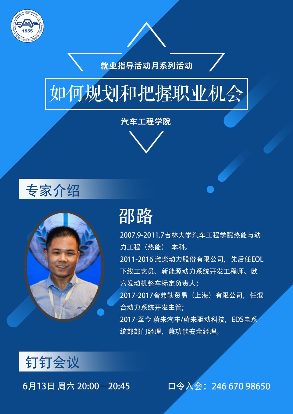 为使同学们认清就业形势,加强对行业与企业的了解,明确就业方向及目标,6月13日晚上20时,yd2333云顶电子游戏举办了“如何规划和把握职业机会”就业指导讲座。学院能源与动力工程专业2011届毕业生,历任潍柴动力公司工程师、舍弗勒公司系统开发主管,现任蔚来汽车EDS电部门部门经理兼功能安全经理的邵路进行分享经验,会议由学院热能系主任李明老师主持。