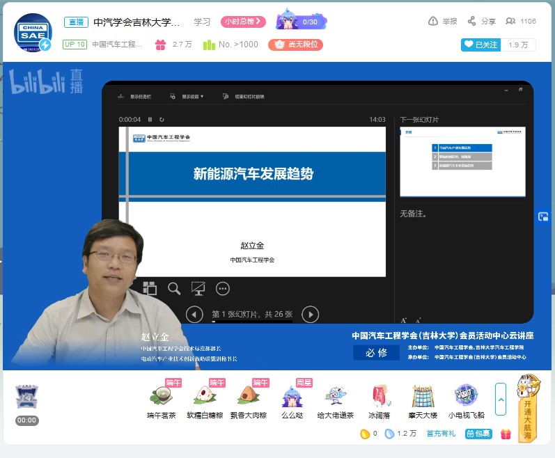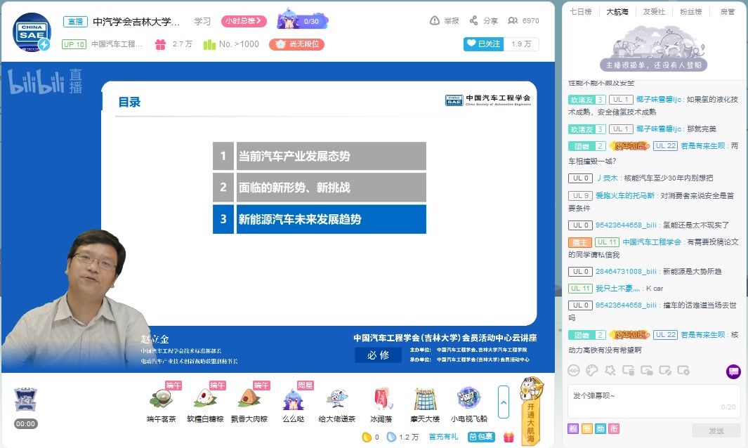 为帮助学生拓展视野,明确发展方向,树立正确的就业观。6月18日下午,由中国汽车工程学会、吉林大学主办,中国汽车工程学会(吉林大学)会员活动中心承办的“新能源汽车发展趋势”云讲座在bilibili“中国汽车工程学会”的直播间进行。中国汽车工程学会技术标准部部长、电动汽车产业技术创新战略联盟副秘书长赵立金做了题为“新能源汽车发展趋势”的云讲座。讲座由yd2333云顶电子游戏学生工作办公室主任吴昊主持。
