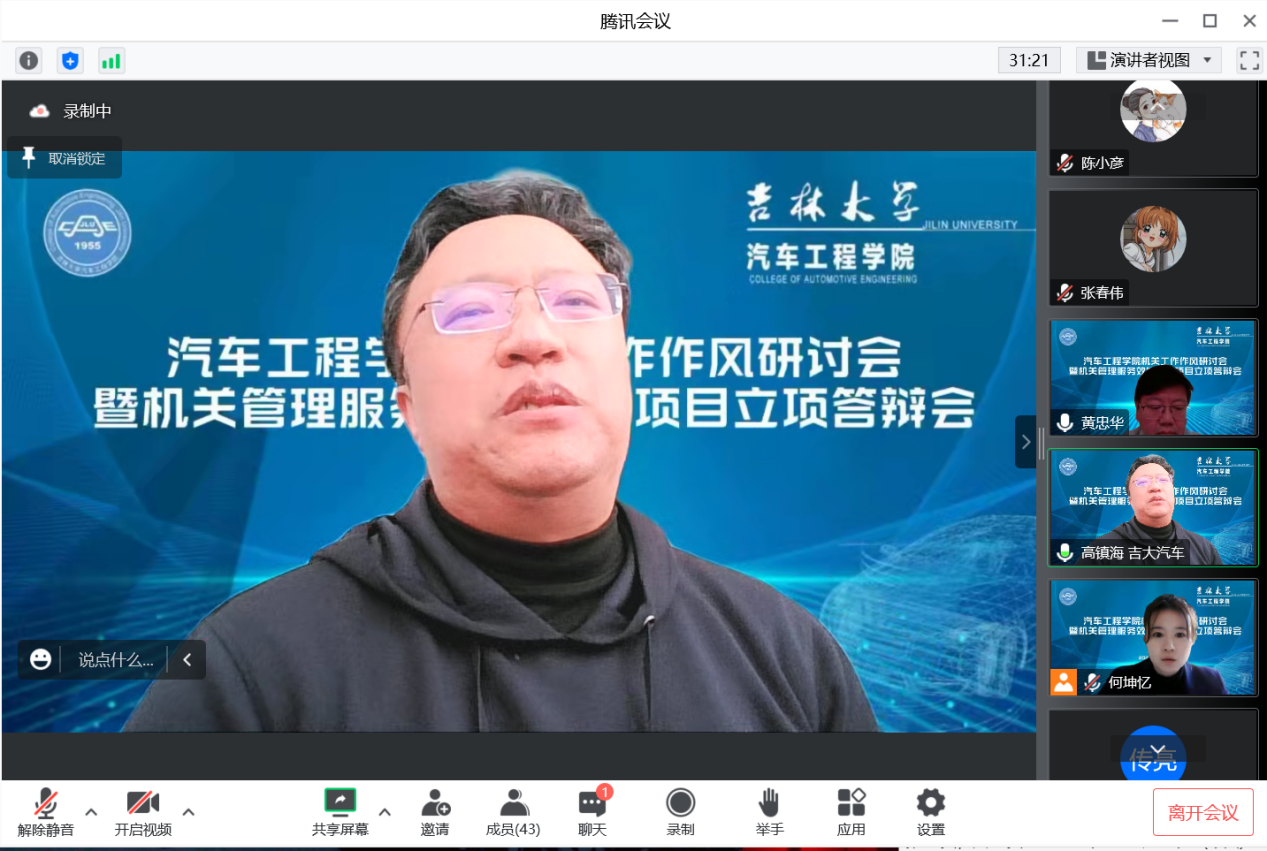 2022年12月1日上午,yd2333云顶电子游戏机关工作作风研讨会暨机关管理服务效能提升项目立项答辩会成功举行。yd2333云顶电子游戏、汽车仿真与控制国家重点实验室领导班子成员,各系所主任、教师代表,机关各科室全体工作人员等50余人参加了会议。会议由党委书记黄忠华主持。