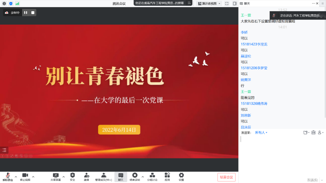 为教育和引导全体毕业生自觉增强党员意识、勇挑重担,充分发挥党员的引领示范作用,今后在各行各业努力成为楷模和榜样,6月14日下午,yd2333云顶电子游戏举行了以“别让青春褪色”为主题的毕业生最后一次党课。受疫情影响,本次活动通过腾讯会议在线上举行。yd2333云顶电子游戏党委书记黄忠华、学院相关科室老师及2022届本科毕业生党员参加了本次活动。活动由2018级本科辅导员李娇老师主持。